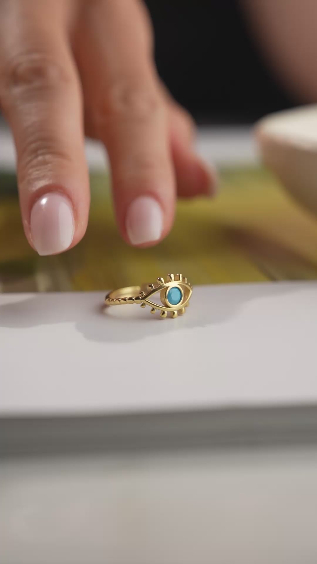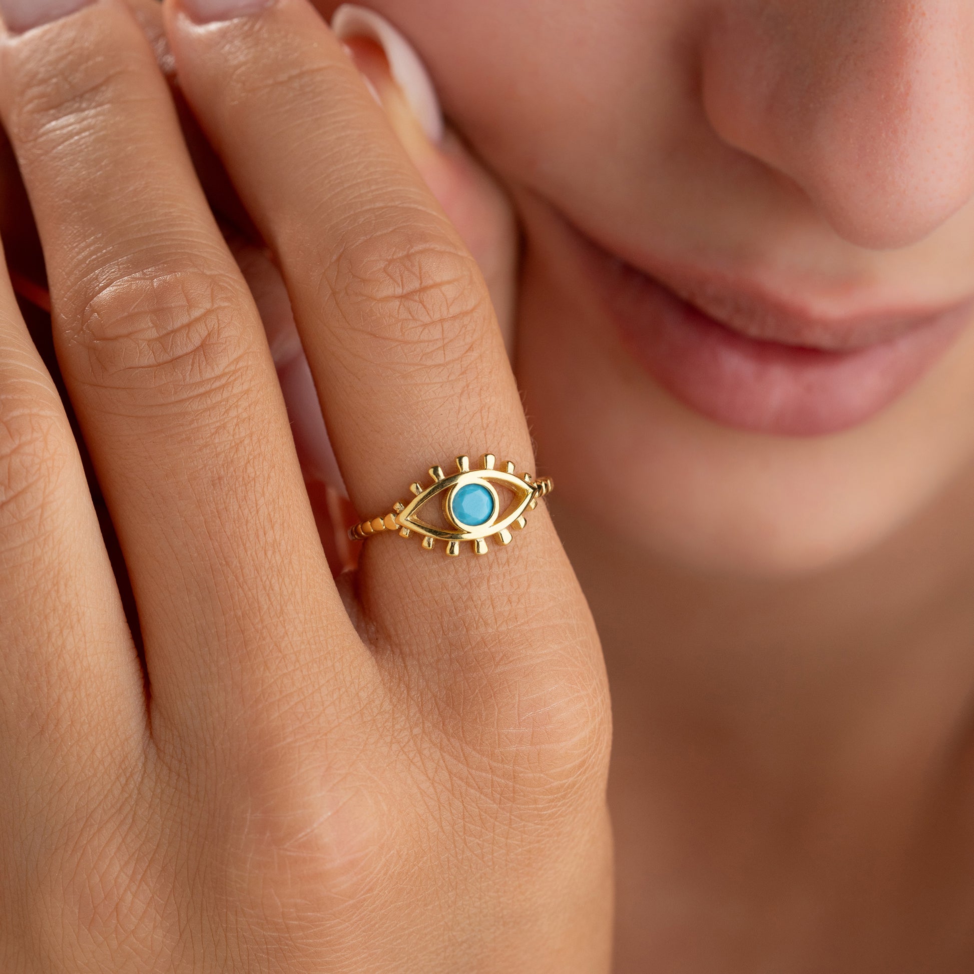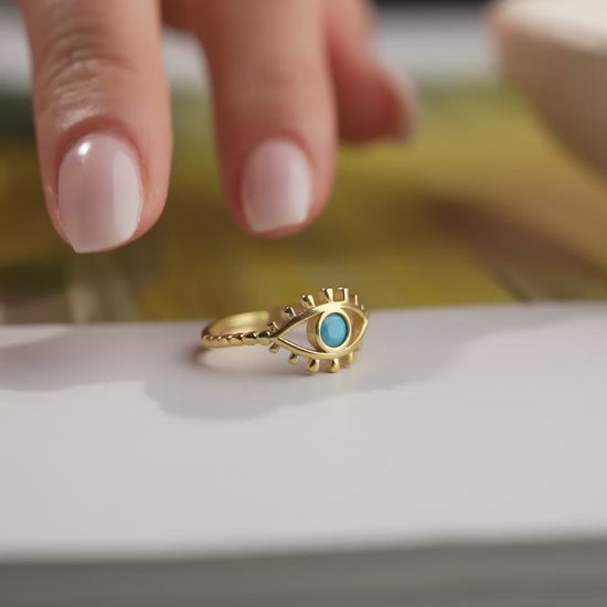 Modern tasarımlı, nazar boncuğu detaylı 925 ayar gümüş altın kaplama yüzük.