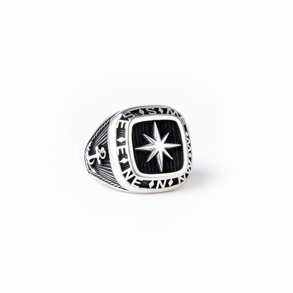 Kuzey Yıldızı, yüzyıllardır yönünü bulmak isteyen gezginlerin ve denizcilerin yol göstericisi olmuştur. Bu yüzük, hem sembolik anlamı hem de detaylı işçiliğiyle öne çıkan bir parçadır. Koyu zemin üzerine parlak yıldız figürü, kararlılığı ve hedef odaklı yaşamı temsil eder. Yan kısımlarda yer alan gümüş çapa figürü ise sadakat ve sağlamlığı simgeler.