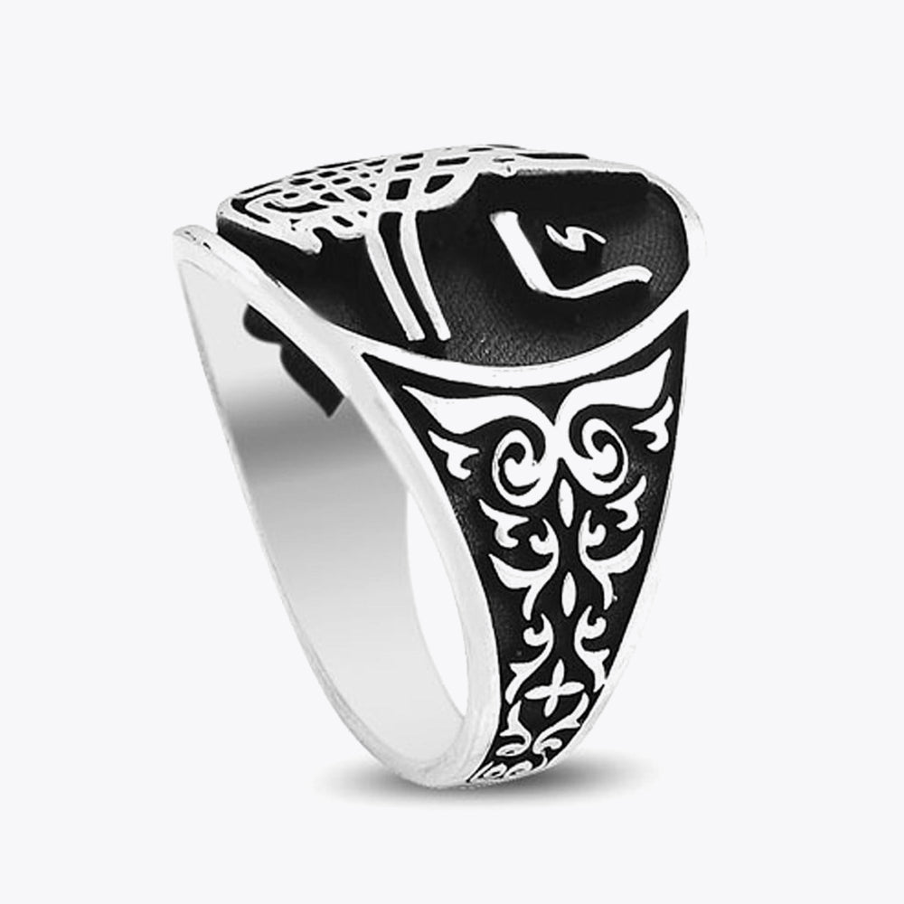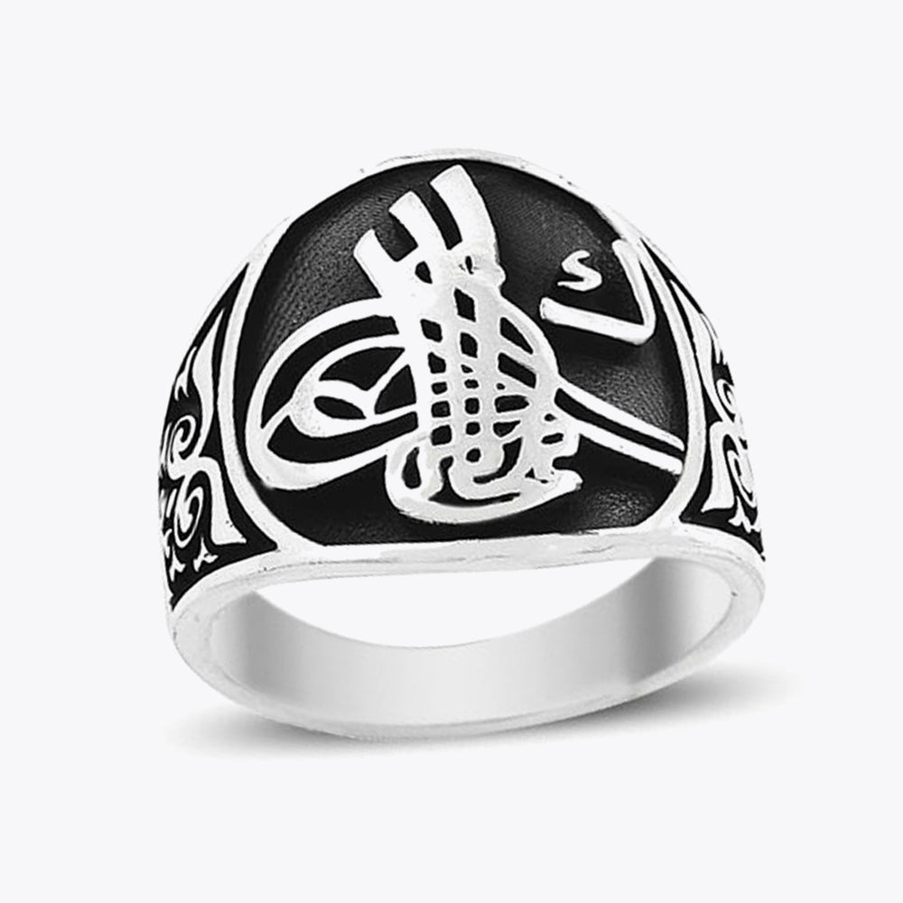 Siyah zemin üzerine gümüş kabartmalı Osmanlı tuğrası ile tasarlanmış 925 ayar gümüş erkek yüzük.
