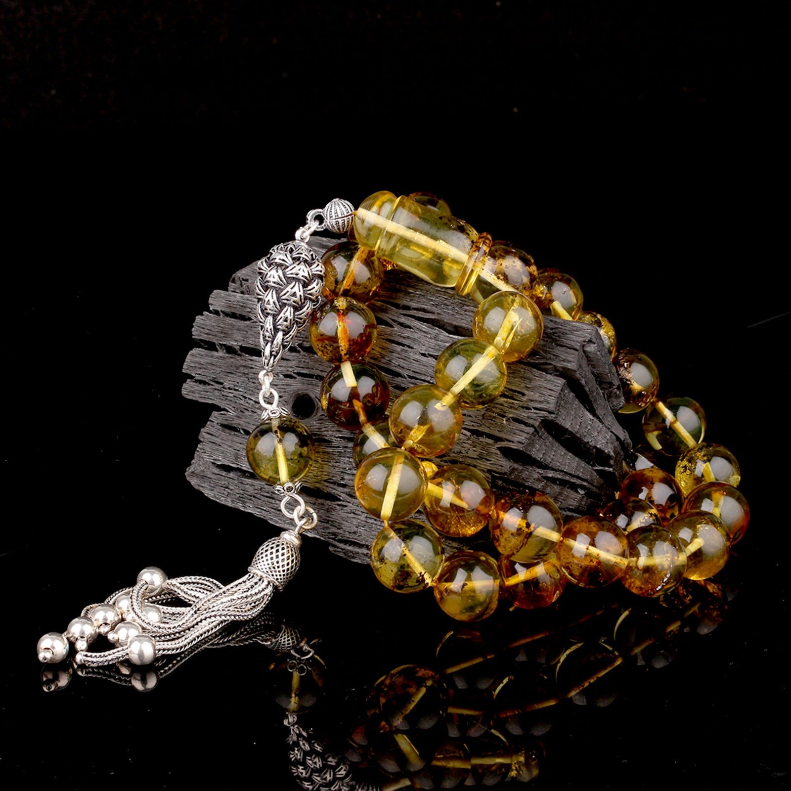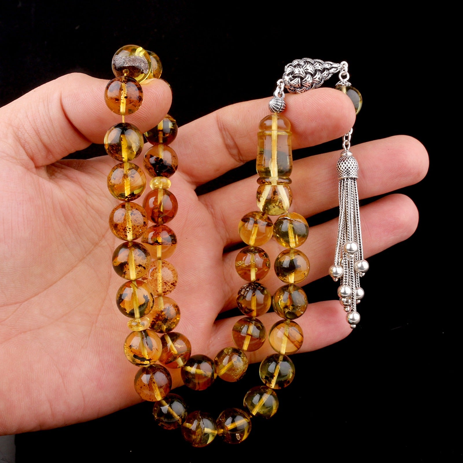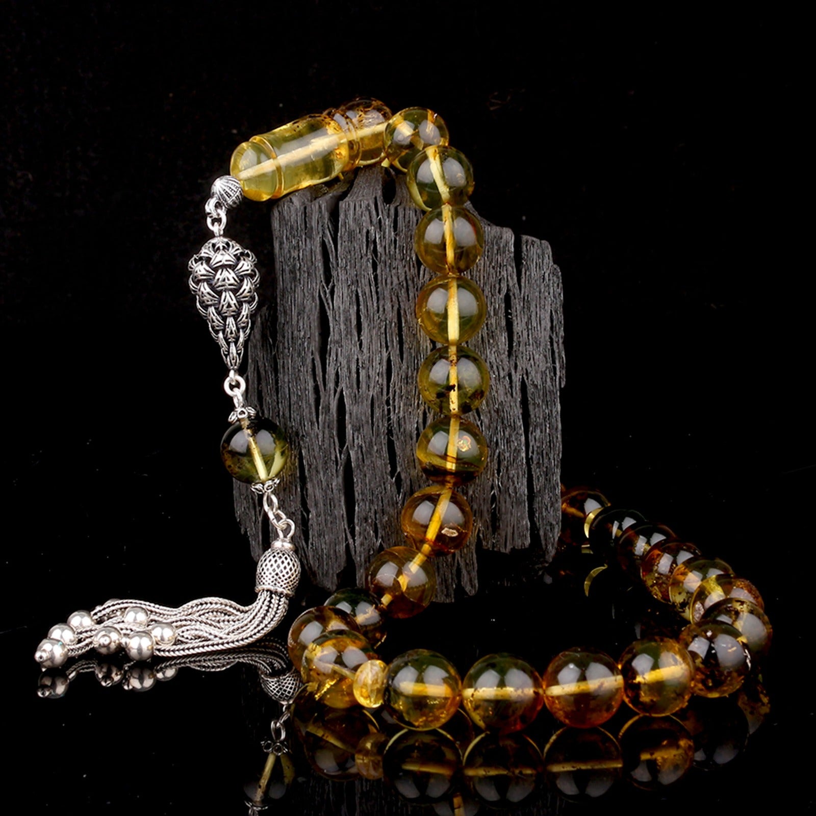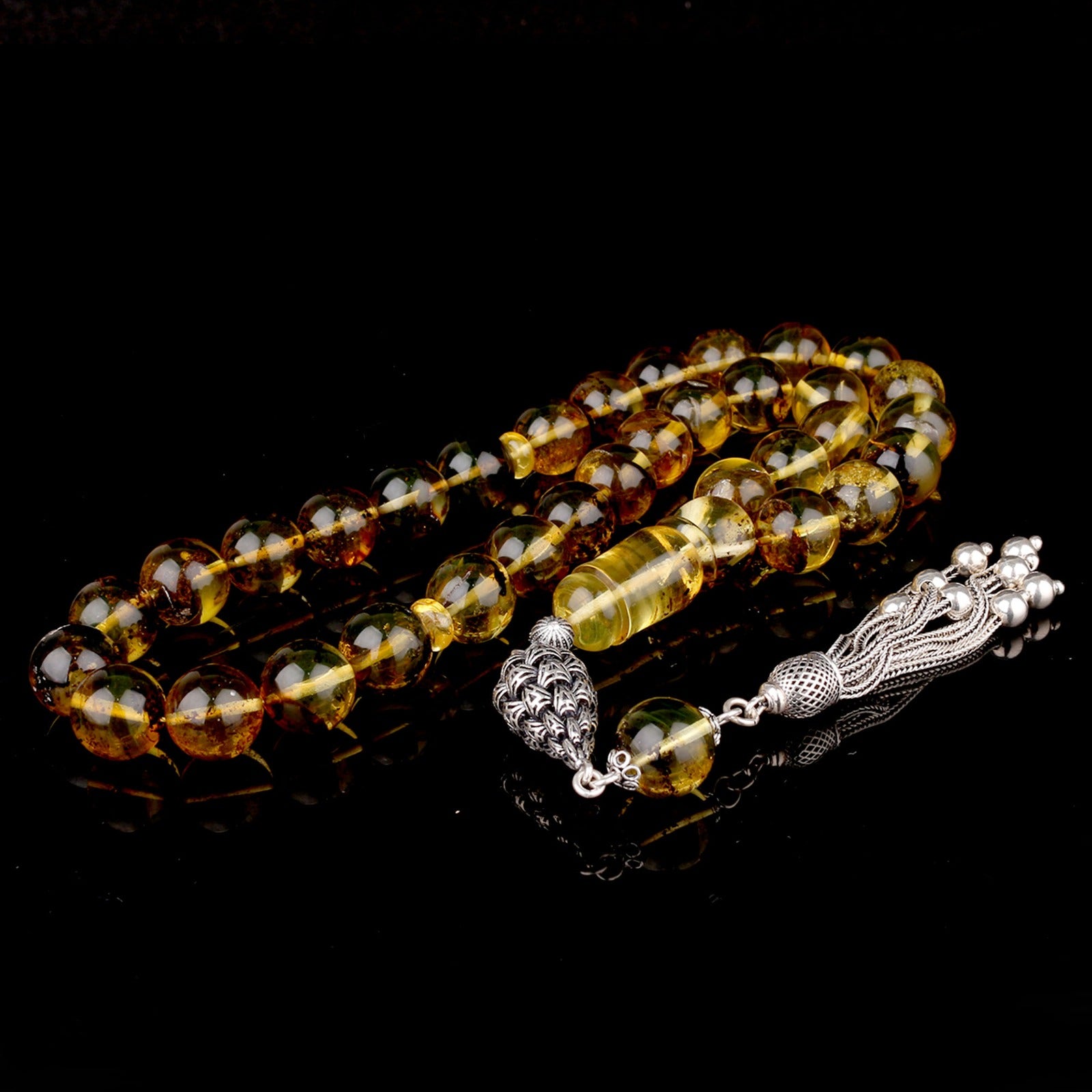 925 Ayar Gümüş Fizyon Püsküllü, orijinal ve sertifikalı fosil damla kehribar tesbih.