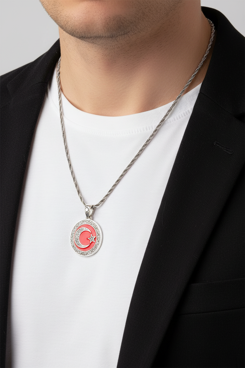 Gravür işlemeli 925 ayar gümüş, kırmızı zeminli büyük boy Ay Yıldız kolye modeli.