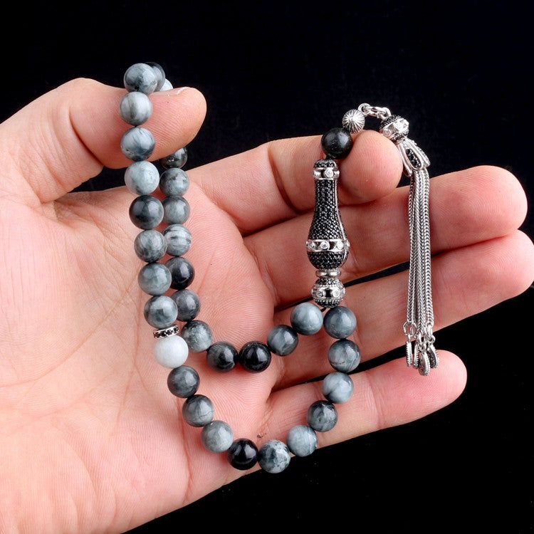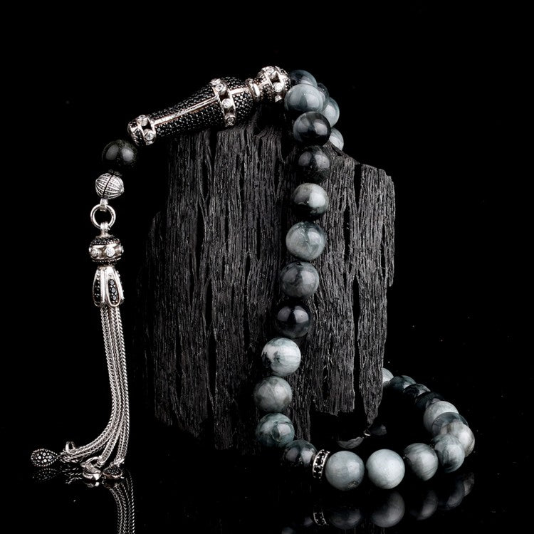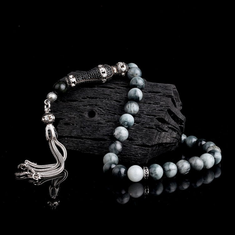 Gri kaplangözü taşları ve zirkon set püskülleriyle tasarlanmış şık 925 ayar gümüş tesbih.