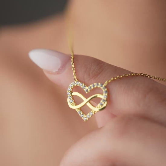 Zirkon taşlarla süslenmiş kalp ve sonsuzluk sembollü 925 ayar gümüş kolye.