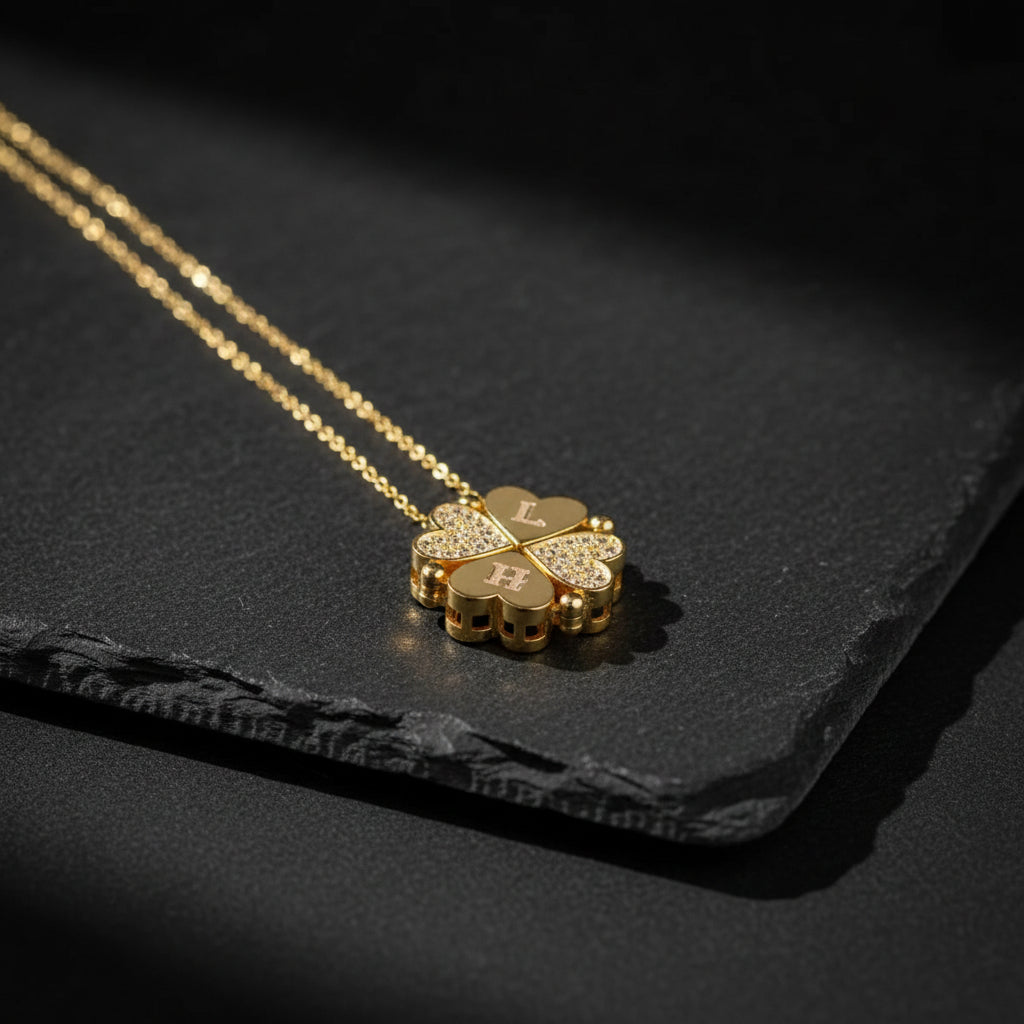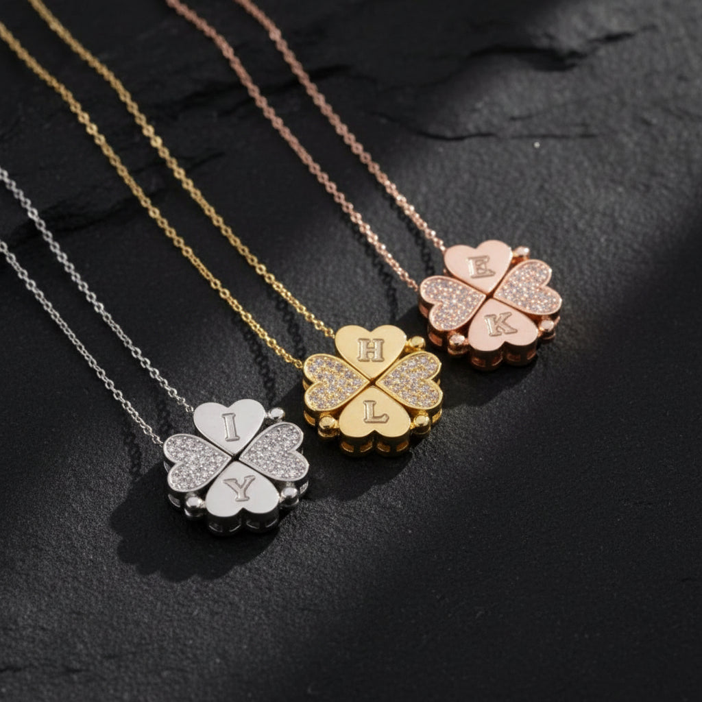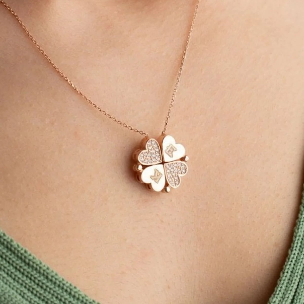 Kişiye özel harfli yonca gümüş kolye, açılabilir kalp detayları ve zarif taşlı tasarımıyla anlamlı bir hediye seçeneğidir.