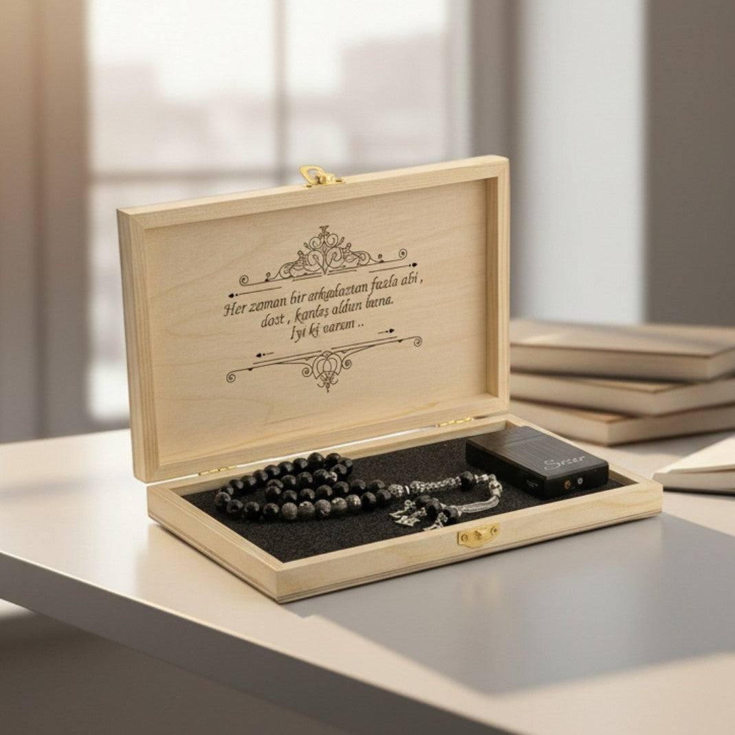 İsme özel çakmak ve tesbih, not yazılı şık ahşap kutusunda hediye seti.