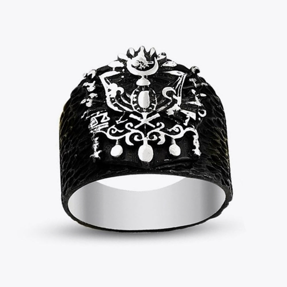 Tam yüzeyi kaplayan geniş tasarımıyla, Osmanlı armalı 925 ayar gümüş erkek yüzük.
