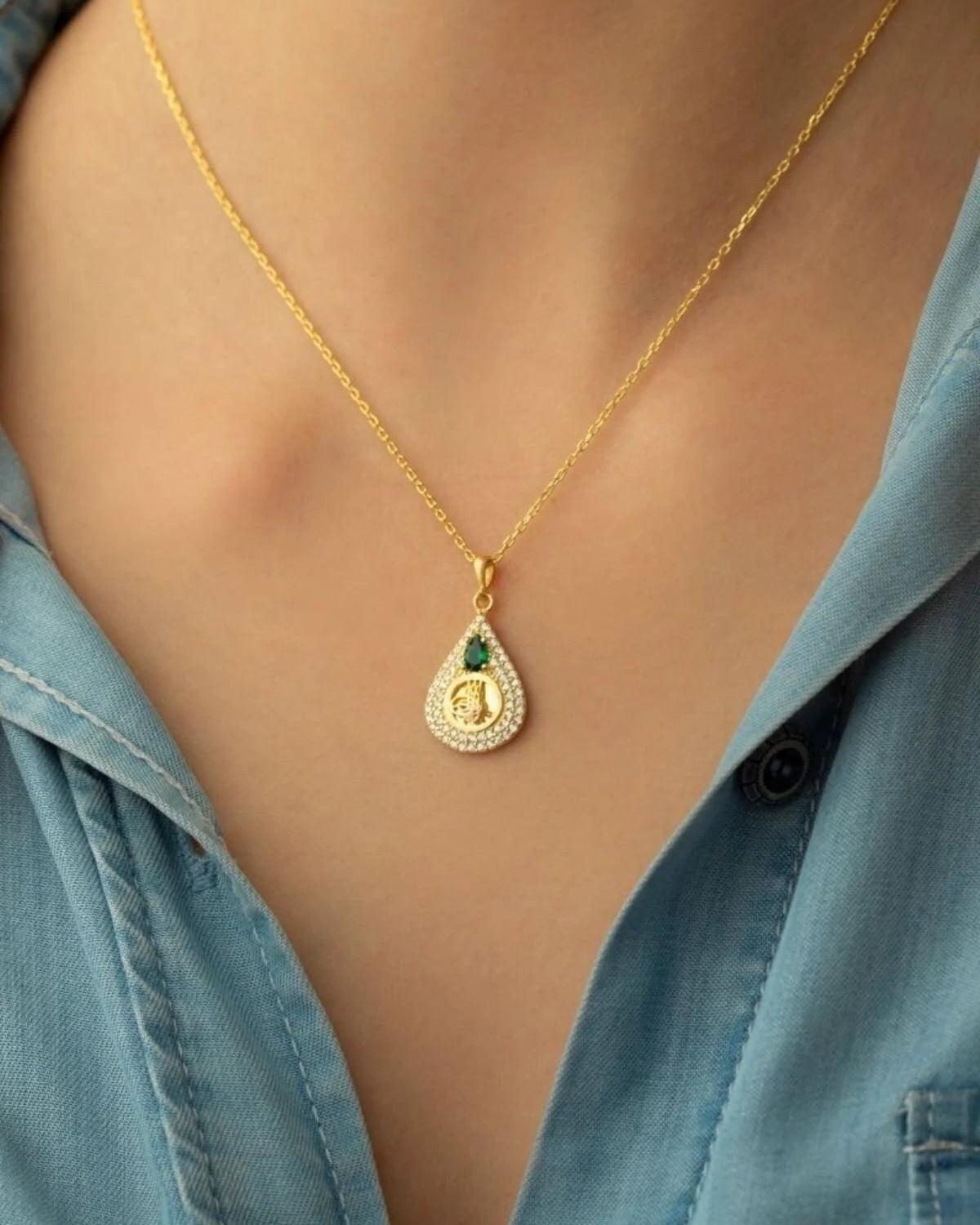 Zarif damla formunda tasarlanmış, zirkon taşlarla çevrelenmiş ve Osmanlı tuğrası ile süslenmiş 925 ayar gümüş kolye.